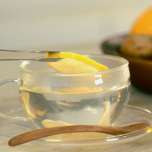 カップに1を入れてお湯を注いで軽く混ぜ合わせて、レモンを入れたら完成。