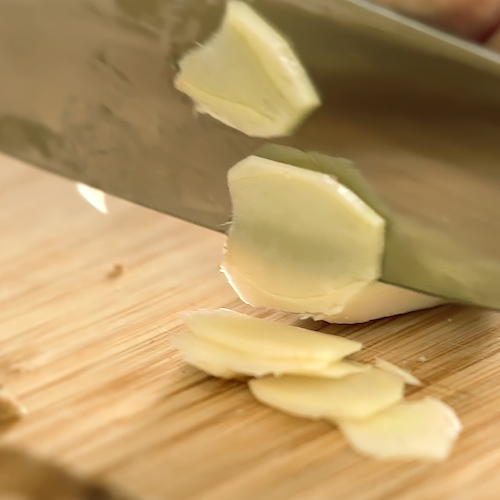 しょうがを包丁もしくはスライサーで薄くスライスする。