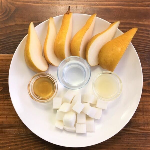 大根は皮を剥き、一口大に切る。洋梨は皮と芯をとり、一口大に切る。