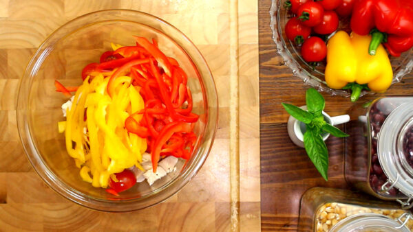 木綿豆腐と1は1.5cmの角切り、ミニトマトは半分、赤・黄パプリカは細切りにする。