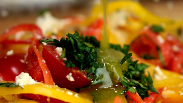 2とA、刻んだバジルを和え、器に盛り付ける。