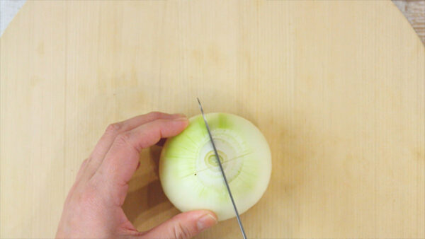 たまねぎは皮をむいて十字に切り込みを入れ、切り込みを下にして小鍋に入れる。