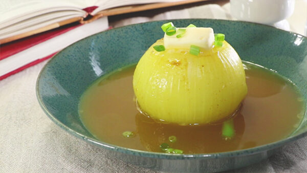 ・たまねぎを丸ごと使ったスープです。食べにくさが、早食い防止にもなります。