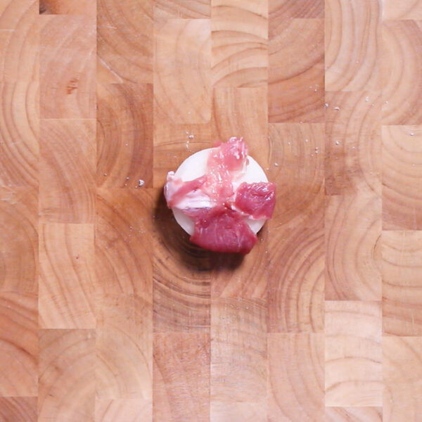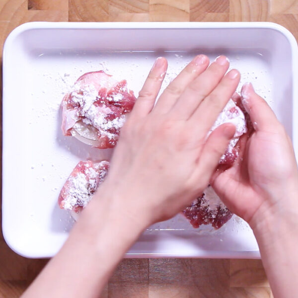 豚肩ロース肉2枚を十字に重ねて塩、胡椒をふりかけ、1のたまねぎを包む。同様のものを4つ作る。