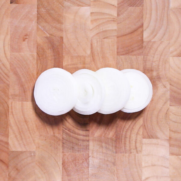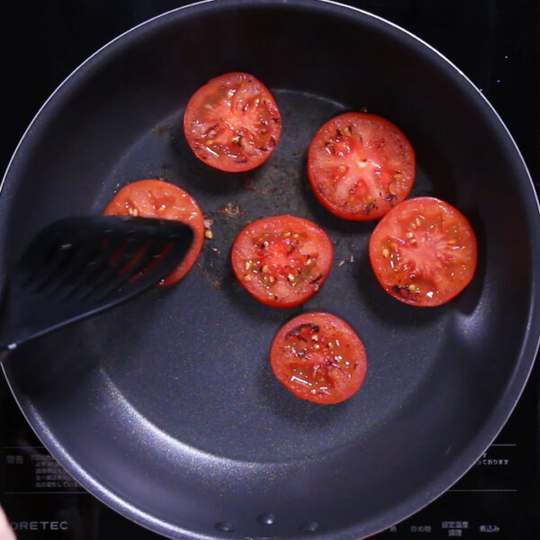 たまねぎを4等分の輪切りにする。トマトも厚めの輪切りにする。
