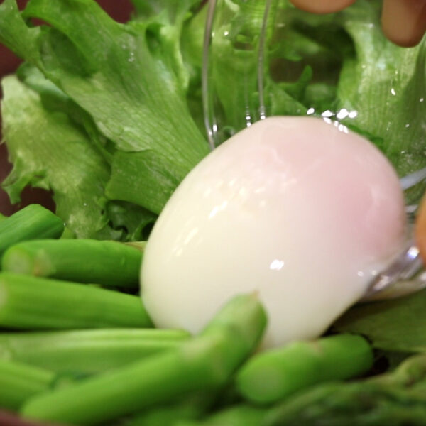 食べやすい大きさに切ったリーフレタス、1を盛り付け温泉卵を飾る。