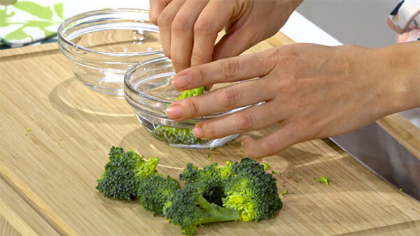 ブロッコリーは小房に分けてため水で洗い、耐熱容器に入れてラップをし、600Wの電子レンジで2分〜加熱する。