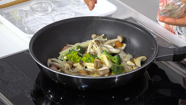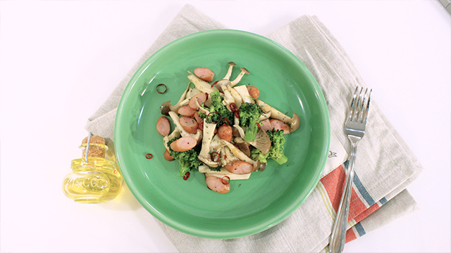 フライパンにオリーブ油を熱し、にんにく、唐辛子を弱火で炒め、きのこ類、ウインナー、ブロッコリー、塩を加え強火でさっと炒めたら、黒胡椒を加える。