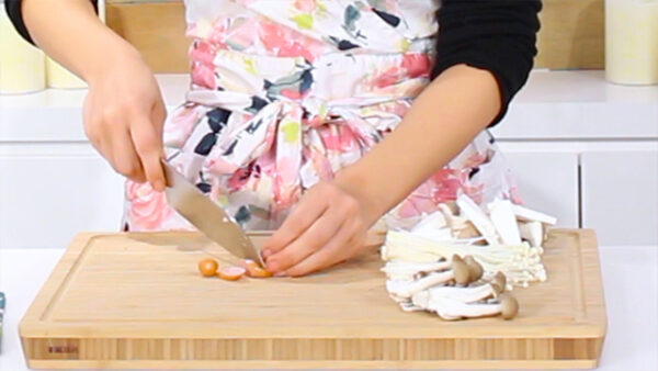 えのきだけ、エリンギ、しめじは石づきを除き、エリンギは3mmの薄切り、しめじは小房に分ける。ウインナーは斜め薄切りにする。