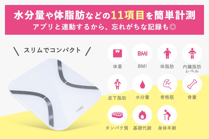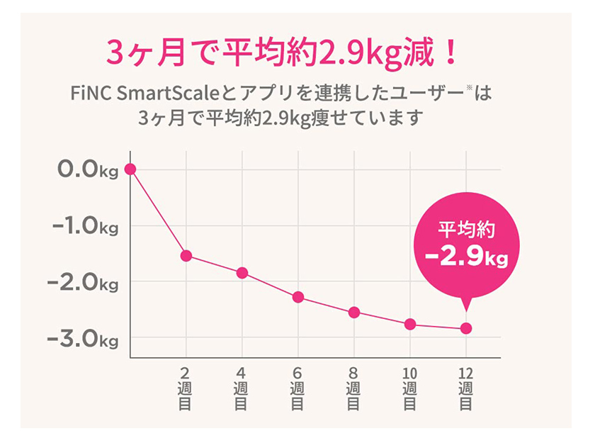 FiNCオリジナル体組成計は、アプリと連動して自動で体重を記録してくれるすぐれもの。体組成計とアプリを連携した方は3ヶ月で平均約2.9kgも痩せたという結果も出ています。