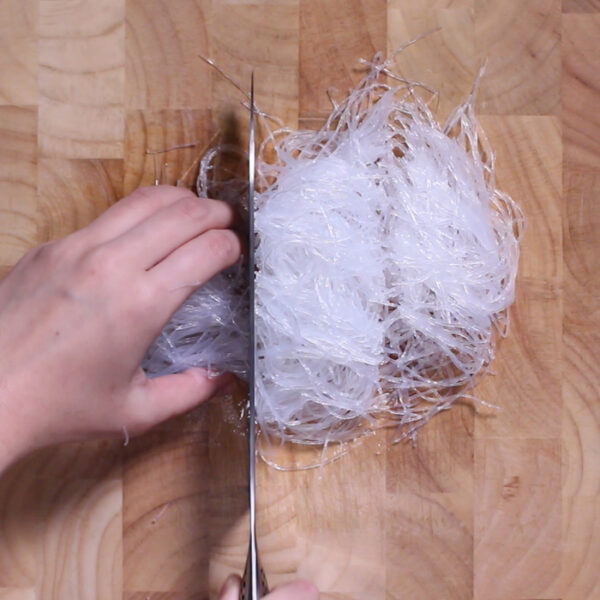 緑豆春雨はぬるま湯に3分漬けてもどし、食べやすい長さに切って水気を切る。