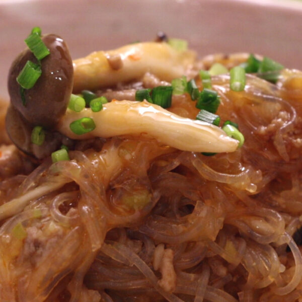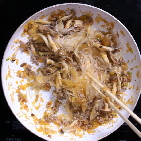 熱したフライパンで豚ひき肉を炒め、色が変わってきたらにんにく、しょうが、長ねぎ、豆板醤を加え炒める。きのこを加えてさらに炒め、しんなりしてきたら春雨を加え炒める。