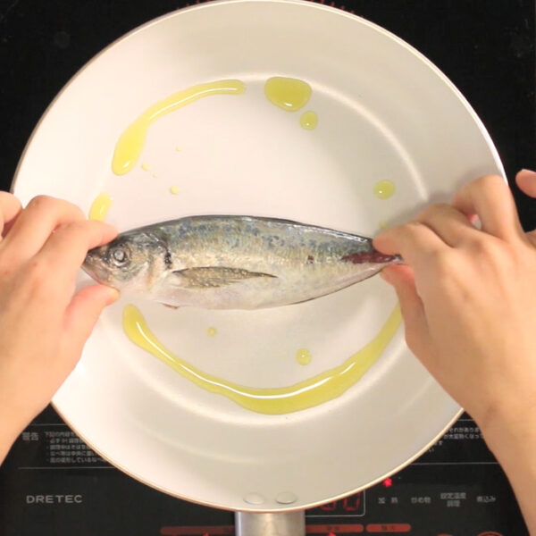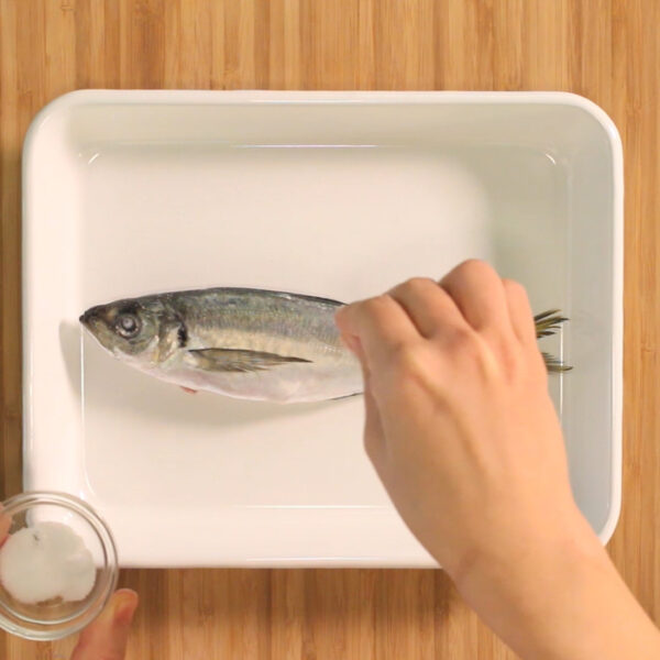 まあじはゼイゴ、ハラワタを取り除き、下処理が済んだら塩と黒胡椒で下味をつける。