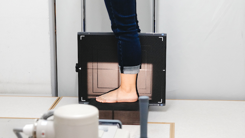 立って足に体重をかけた状態で真正面と真横から撮影。足を構成する骨が、どのような形になっているか、はっきりとわかります。