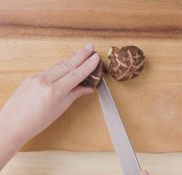 しめじ、舞茸は石づきをとり、ほぐしておく。しいたけは薄切りにしておく。油揚げは横半分に切った後、1cm幅に切っておく。