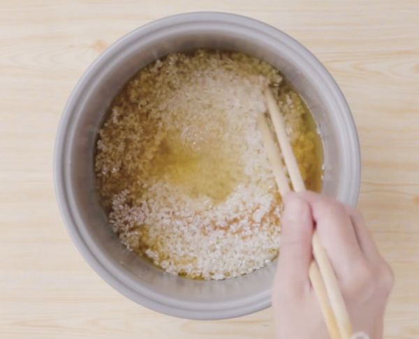 2に1を入れたら、軽く混ぜ炊飯モードで炊く。
