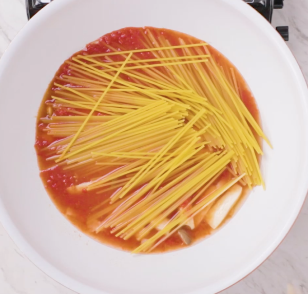 エリンギを入れてしんなりしてきたらA、半分に折ったパスタを入れて時々よく混ぜながら表記時間フタをして煮込む。(弱火〜中火)