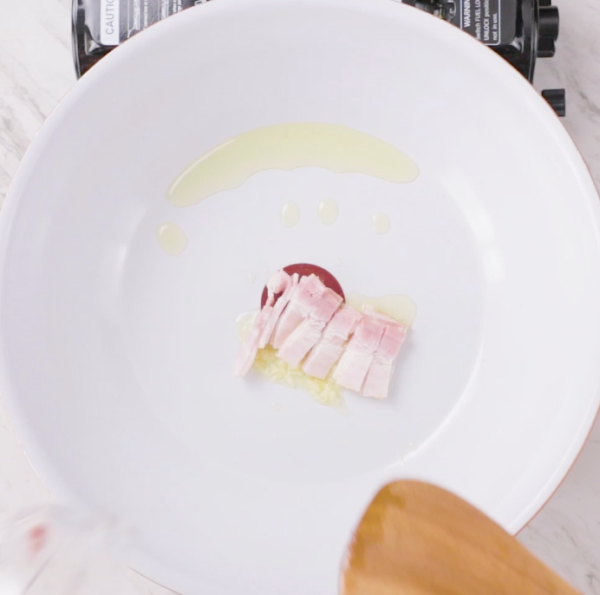 フライパンにオリーブ油、にんにくを入れて香りがしてきたらベーコンを入れる(弱火)。