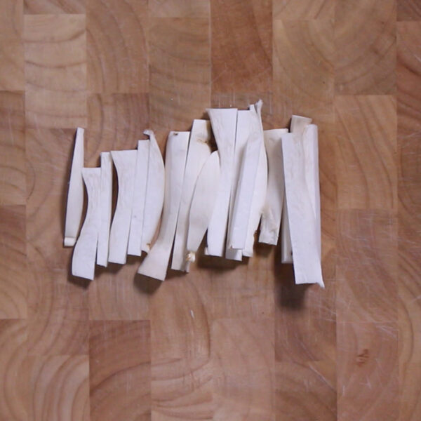 エリンギは縦に1.5cm程度の厚みに切り、棒状にする。