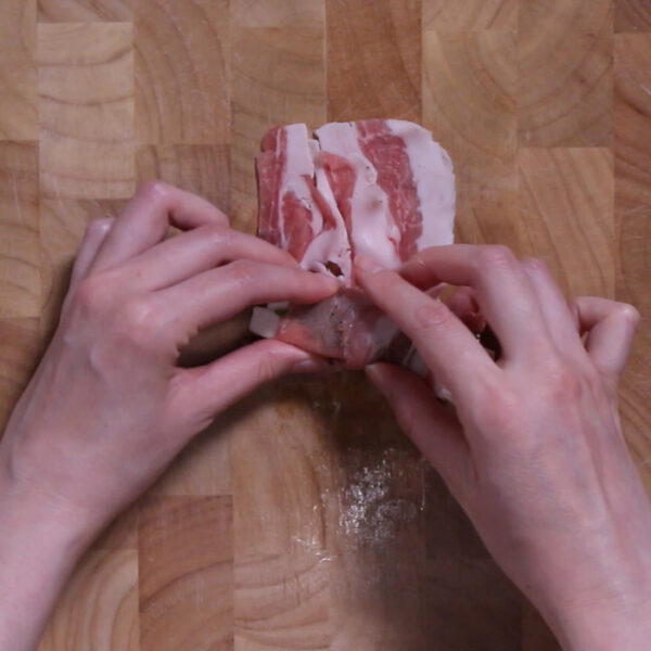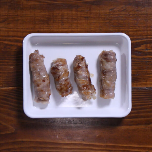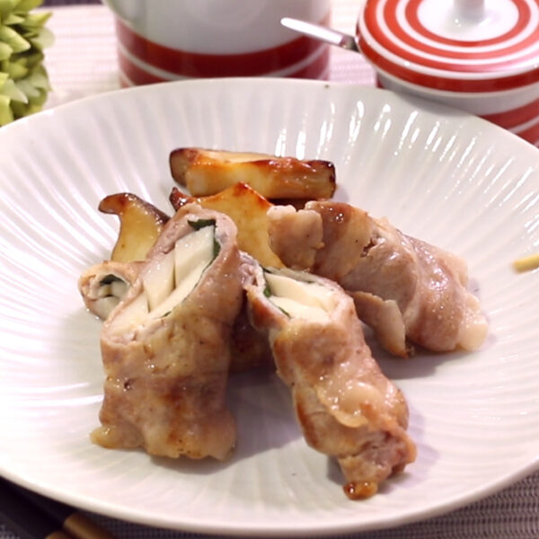 1の豚肉に大葉をのせ、2のエリンギを大葉の上にのせて巻く。