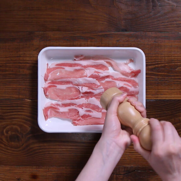 豚肉をまな板などに広げ、塩、胡椒をする。