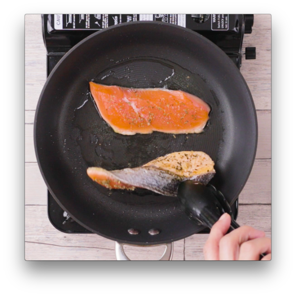 フライパンにオリーブ油を熱し、鮭を中火で焼く。