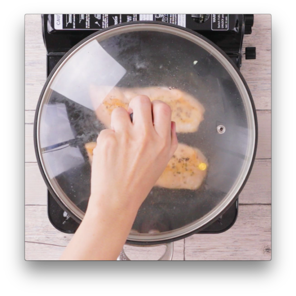 両面に焼き色がついたら、白ワインを回し入れ蒸し焼きにする。