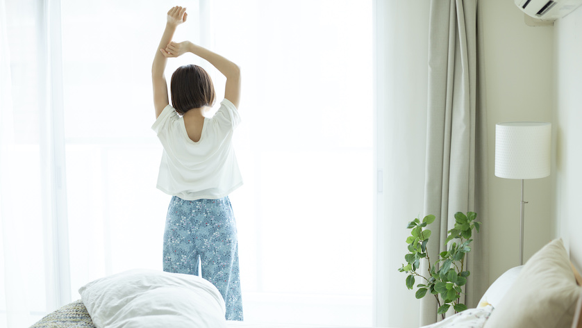 できるだけ朝の同じ時間帯に起きましょう。人間には約24時間プラス数分の周期でリズムを刻む体内時計があります。朝の強い光は体内時計を早める方向に、夜の光はこれを遅らせる方向に働きます。朝日を浴びることで、体内時計がリセットされ、寝起きの質が上がるのです。