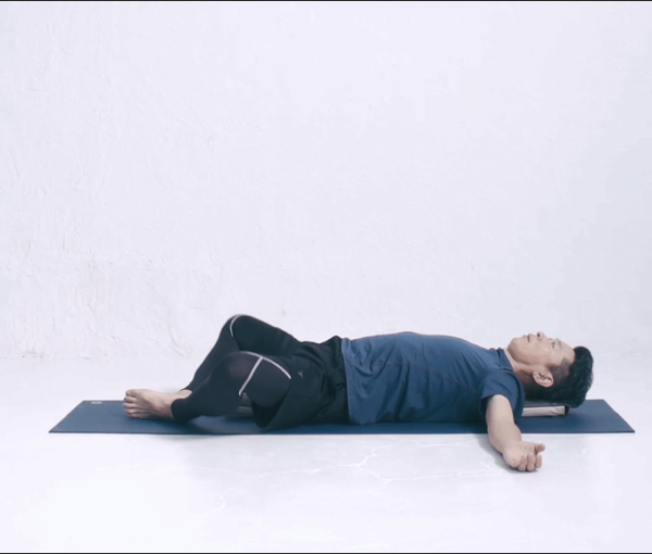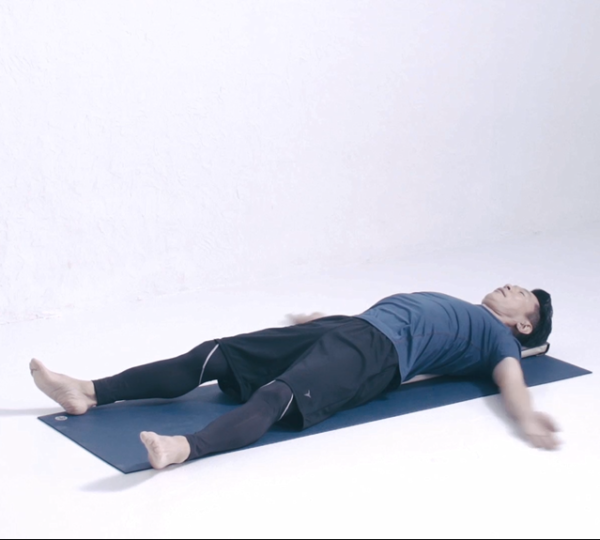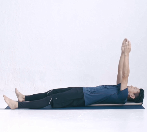 仰向けの姿勢から皿に天井に指先を伸ばしていきます。力を抜いてリラックスを繰り返していきます。