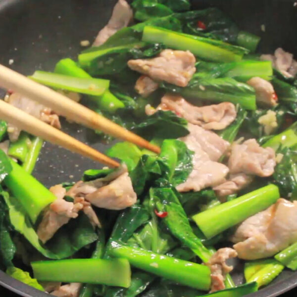 豚肉に火が通ったら2を加えて炒め、オイスターソースを加えて混ぜる。