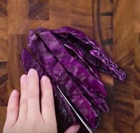 キャベツは2cm角の大きさに切り、赤たまねぎは薄くスライスしておく。